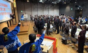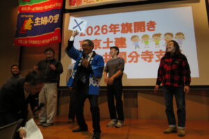 1月16日(金)武蔵小金井宮地楽器ホールにて、「新春旗開き」を開催しました。今回は平日夜間開催のため、若手参加者は少なかったですが、組合員・家族54名、来賓23名、合計77名の参加者でした。ご来賓のあいさつの後、お楽しみ会では〇✕クイズを行い、昨年の組合活動を問題にしたり、参加者を壇上に上げてこれができるか、例えば「アリゴリズム行進」や「チェッチェッコリ」などを踊ってもらいそれを問題にしました。来賓・参加者を交え、笑いあり楽しいイベントとなり、今年一年、明るく組合運動をスタートさせる取り組みとなりました。今後も若手・子育て世代も参加しやすい企画を行っていきますので、本年も組合活動をよろしくお願いいたします。